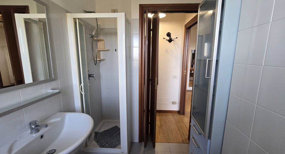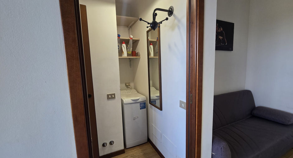 Proseguendo troviamo il disimpegno perfetto come zona lavanderia da cui accediamo al luminoso bagno finestrato con doccia.